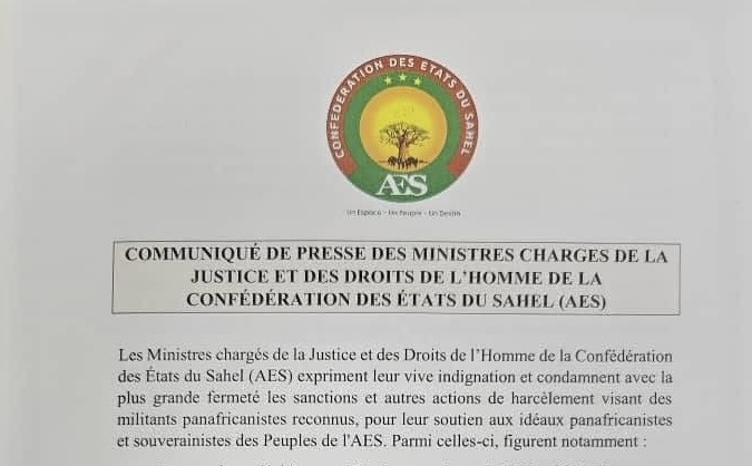 Les Ministres chargés de la Justice et des Droits de l’Homme de la Confédération des Etats du Sahel (AES) expriment leur vive indignation et condamnent avec la plus grande fermeté les sanctions et autres actions de harcèlement visant des militants panafricanistes reconnus, pour leur soutien aux idéaux panafricanistes et souverainistes des Peuples de TAES. Parmi celles-ci, figurent notamment :