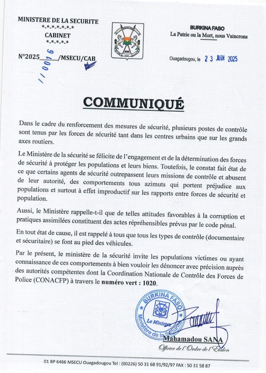 Dans un communiqué en date de ce Lundi 23 Juin 2025, le Ministère de la sécurité rappel que dans le cadre du renforcement des mesures de sécurité, plusieurs postes de contrôle sont tenus par les forces de sécurité tant dans les centres urbains que sur les grands axes routiers.