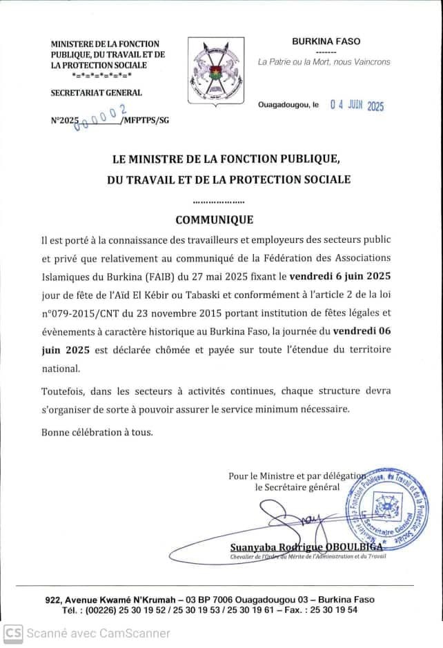 Les employeurs et les travailleurs des secteurs public et privé sont informés que la journée du vendredi 6 juin 2025 est déclarée chômée et payée sur toute l’étendue du territoire national en raison de la Tabaski 2025.